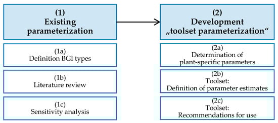 Therefore, this study focuses on the systematic preparation of BGI model parameterization in order to develop a reliable basis for further application and validation of modeling BGI in urban settings. A transferable toolset should be developed focusing on SWMM-LID parameterization supplemented by SWMM-UrbanEVA. The development contains the following topics: