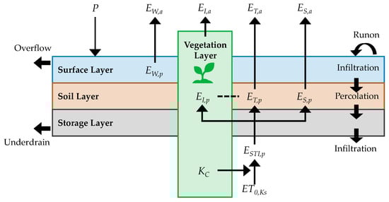 One widely used rainfall–runoff model is the Storm Water Management Model (SWMM) developed by the US Environmental Protection Agency (EPA) [37]. It includes a module called Low Impact Development (LID) that allows the simulation of various BGIs and other stormwater management measures such as permeable pavements and rainwater harvesting [38]. Several studies have addressed the shortcomings of oversimplified modeling of ET processes in SWMM-LID modules [17,39,40]. Therefore, SWMM-UrbanEVA was developed to address the existing deficiencies in modeling urban BGI evapotranspiration [41]. The fully integrated submodel complements SWMM by enabling the plant-specific modeling of evapotranspiration for BGIs. It has undergone validation for simulating the water balance of different BGIs [41,42,43], but further investigations are required for parameterization.