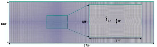 Figure 1 shows the plan view of the mesh around the oblong pier. As seen in Figure 1, the origin of the Cartesian coordinate system was at the left lateral border of the rectangular pier. The mesh is finer at the pier and bed surface and grows increasingly coarser as one moves away. The spatial increase in grid cell size was accomplished with an expansion ratio of approximately 1.01, taking into account that the grid should not be too coarse where vortices are likely to form.