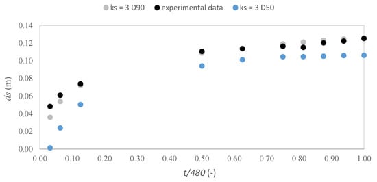 Bearing in mind that small time steps give more accurate results but also require more computational time to reach the stability condition, a balance was made between the accuracy of the results and the required simulation time (up to t = 480 min). The SSIIM model is numerically stable for long time steps, as noted above [19,36]; numerical simulations were performed using a 5-s time step. Once selected, two different values for the bed roughness height were considered, namely = 3 and = 3. The agreement between experimental measurements and model results of the scour depth at 0.03 m from the pier face was used as the main calibration criterion. The bed roughness height parameter is the main parameter responsible for the uncertainties involved in the empirical formulae relating it to the grain size distribution. Thus, in line with Figure 2, a bed roughness height of 0.0051 m (in the present case = 3) was chosen, confirming the relationship proposed by Van Rijn [56].