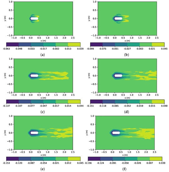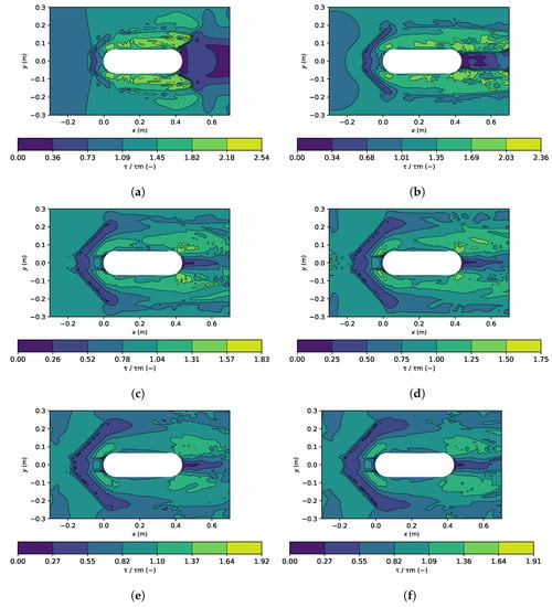 Contours of the normalized mean bed shear stress (/) around the oblong bridge pier are shown in Figure 6, where is the bed shear stress of the approach flow. An initial preponderance of the normalised bed shear stress can be observed at the sides of the pier (Figure 6a), which corresponds to the scour development (shown in Figure 4a). For the remaining times, up to t = 480 min, an increase in / was obtained immediately in front of the pier, indicating higher scour depths at the front of the oblong pier (Figure 6b–f). Near the upstream edge of the scour hole (the “<” shape), the bed shear stress is lower than in the region where the horseshoe vortex system occurs, which is consistent with study [11] and references therein.