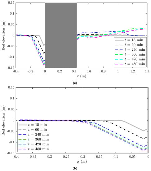 The rate of growth of the scour hole has slowed down over time. The width of the scour hole upstream of the pier ranges between 0.73W (t = 15 min) and 2.5W (t = 480 min), as can be seen in Figure 5a. The maximum scour depth was observed along the mid-plane of the oblong pier model, a relevant parameter for stability analysis of bridge foundations, and was confirmed to occur at a distance of 0.015 m from the pier face (equivalent to a distance of 0.14W).