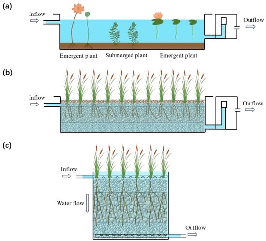 Constructed wetland configurations: (a) A free water surface flow constructed wetland with three types of plants; (b) Planted horizontal subsurface flow constructed wetland with Typha orientalis; (c) Planted vertical subsurface flow constructed wetland with Typha orientalis.