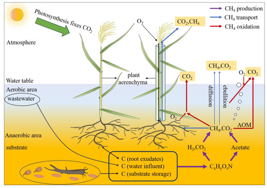 The emission of CH4 from CWs to the atmosphere depends on the balance of activities of methanogen and methanotrophs [97]. Recently, different mechanisms of methane production and oxidation have been discovered.