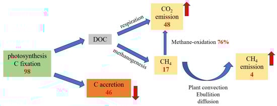 Summary of estimated rates of carbon cycling in the Phragmites australis wetland at Vejlerne Nature Reserve, Denmark, based on the reference [87]. The red narrows denote where the carbon ends up. Figures denote the estimated annual rates of the processes indicated (unit: mol C m−2 year−1).
