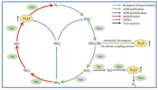 Most studies have suggested that N2O in the CW system is formed in the process of nitrifying and denitrification via microorganisms, as shown in Figure 5. Inorganic autotrophic microorganisms perform the complete nitrification process and consist of two processes. The first process is the oxidation of ammonia nitrogen to nitrite via ammonia-oxidizing bacteria (AOB). The catalytic enzymes of this process include ammonia monooxygenase (Amo) and hydroxylamine oxidoreductase (Hao) [123]. The second process is the oxidation of nitrite to nitrate via nitrite-oxidizing bacteria (NOB). The key enzyme of this process is nitrite oxidoreductase enzyme (Nor). In the first process, NH4+ is oxidized to NH2OH by Amo, then NH2OH is catalyzed by Hao and generates nitroxyl (HNO) as an intermediate. HNO reacts with another NH2OH molecule, then dimerizes into hyponitrous acid (H2N2O2), and finally chemically decomposes to form N2O [124]. N2O can also be generated through a bio-abiotic coupling process involving the interaction of HNO2 and NH2OH [125]. Hence, the N2O generated from AOB nitrification becomes particularly significant during the shift from aerobic to anaerobic conditions and should not be disregarded [126]. Denitrification is a continuous process (NO3− → NO2− → NO → N2O → N2) in which denitrifiers reduce NO3− to N2 under low oxygen or anaerobic conditions, and N2O is produced as a conventional intermediate product [127]. The catalytic enzymes of this process include nitrate reductase (Nar), nitrite reductase (Nir), nitric oxide reductase (Nor), and nitrous oxide reductase (Nos). The production of N2O in the denitrification process can be attributed to two possible reasons. Firstly, the activity of Nos is influenced by factors such as dissolved oxygen, pH, carbon source, and toxic substances, leading to the accumulation of N2O [128,129,130]. Secondly, certain denitrifiers like Pseudomonas fluorescens lack Nos, causing N2O to be the final product of their denitrification reaction [131].