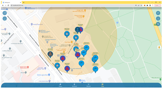 The event reporting interface is based on Google Maps and the nearby reports can be visualized and represented as markers, as can be seen in Figure 3. Each report is recorded in the database with a unique identifier. Information about reports can be viewed publicly, and the application allows the validation, resolution, update, or deletion of a report. The user’s location on the map is determined by the location provided by the browser and is represented by the blue marker for the Finder user (a yellow or red marker for the Fixer or Validator users). Using the map interface, users can add new reports interactively or view reports uploaded by other users.