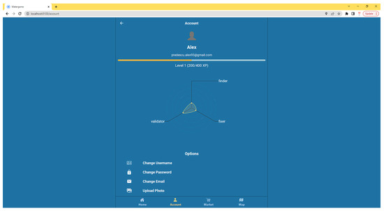 The user’s profile in the app is shown in Figure 4, and consists of a visual representation of the user’s progress in the serious game, according to the proposed crowdsensing roles. Based on this profile, the user’s reputation is calculated, which calculated by the weight of their actions in the interactive reward process. To increase the overall utility of the platform, the reward-based incentive is counter balanced by a regulatory strategy. Reputation is the method of validating participants and is defined to achieve optimal incentives in reporting activities while reducing the risk of over-reporting or false reporting. The reputation is determined by user interactions in the context of urban water infrastructure event reporting scenarios.