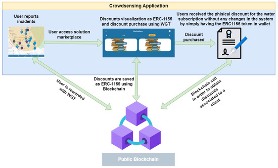 According to the diagram presented in Figure 6, the process starts inside the crowdsensing application by reporting an incident in the water distribution network. After reporting, the incident is saved in the application’s relational database, and the reporter receives a reward that consists of a digital token. The process of receiving tokens involves interaction with the blockchain to transfer tokens from the application administrator wallet to the client wallet. Independently, the user is able to buy, trade, or donate tokens as they want from their wallet (this action also implies interaction with blockchain smart contracts). Once the client has tokens in their wallet, they are able to purchase contract subscription discounts. The user will access the marketplace section and buy the discount. An ERC-1155 token kept on the blockchain will serve as the discount’s representation. Basically, the user will trade native WGT tokens for a discount token. Once the discount token is purchased, the physical discount will be automatically saved in the relational database without any interaction from the solution administrator. The system will permanently scan for users’ digital discounts and update the physical ones in the relational database. Separately from the application, by using blockchain, the user will be able to buy, sell, and trade both application-native tokens and digital discounts on other trading platforms.