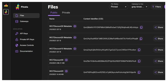 In order to maintain the ERC-1155 token implementation, a decentralized method to store the discount images and metadata was required. For managing the discount tokens, the following decentralized file system was used: https://www.pinata.cloud/ (accessed on 12 May 2023). Figure 9 presents the way in which the ERC-1155 token is saved on the file system.