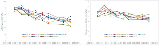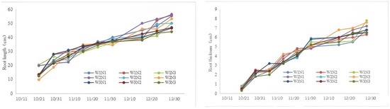 During the growing season, the root length and thickness of white radish increased continuously with time and tended to increase steadily at the end of the reproductive season. The nitrogen content of each organ of white radish during the whole growing season is shown in Figure 3 and Figure 4. The nitrogen content of leaves tends to decrease continuously with the growth of the crop as a whole, with the average nitrogen content of leaves decreasing from 46.5 g/kg to 29.4 g/kg; the nitrogen content of fleshy roots tends to fluctuate and decrease with the growth of the crop as a whole, with the average nitrogen content of fleshy roots decreasing from 27.9 g/kg to 23.3 g/kg.