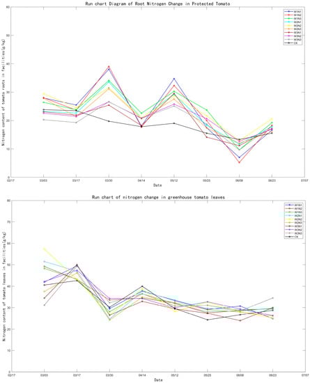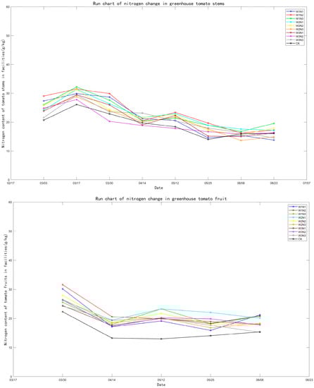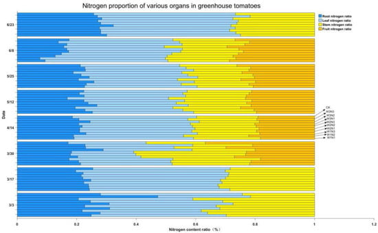 As shown in Figure 5, during the growing season, the dry weight of roots, leaves, and stems of tomatoes increased with plant growth and development, with the most significant increase after the first fertilizer (22 March); the dry matter weight of fruits showed a trend of first increasing and then decreasing, reaching a peak around 25 May. The percentage of nitrogen in the roots of the plants showed a trend of decreasing and then increasing with the growth and development of the plants, with the most obvious increase after the first fertilizer application; the percentage of nitrogen in the leaves showed a trend of decreasing with the growth and development of the plants, while the percentage of nitrogen in the fruits kept increasing; the percentage of nitrogen in the stems was relatively stable throughout the whole reproductive period of the plants, with a certain increase after the three fertilizer applications.