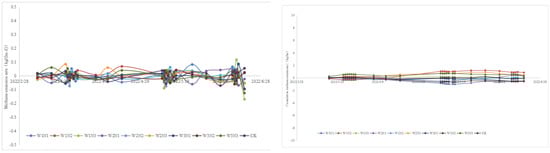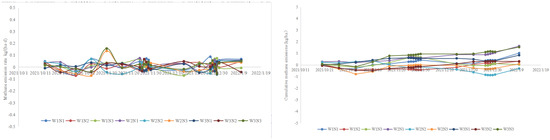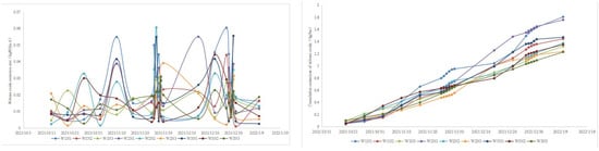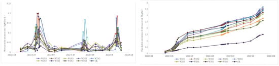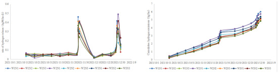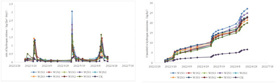 There was no significant difference in the trend of CH4 emission rate among the different water–nitrogen treatments, and the emission rate of CH4 varied slightly above and below the value of 0 during the whole reproductive period and did not respond significantly to external influences; the cumulative emission of CH4 kept changing over time and remained at a stable level of break-even overall (Figure 13 and Figure 14).