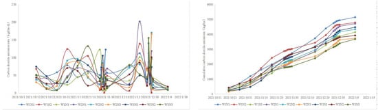 In Figure 7 and Figure 8, the emission rate of NH3 is significantly affected by fertilizer application, and the emission rate of NH3 tends to rise first and then decrease after each fertilizer application, with the peak generally on the first to third day after fertilizer application. The cumulative emission of NH3 gradually increases with crop growth; the cumulative emission of NH3 is 4.8–6.0 kg/ha for white radish and 19.9–27.1 kg/ha for tomato during the whole fertility period.