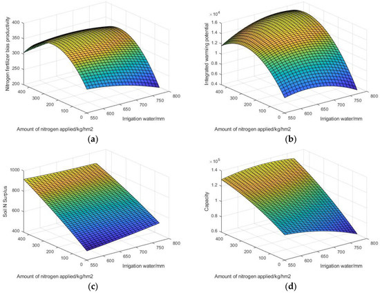 The regression equations for the dependent variables in Table 7 were used to produce a plane projection (Figure 15) and to find the maximum values for each indicator and the corresponding amounts of irrigation and nitrogen applied (Table 8), from which it can be seen that the four indicators cannot be optimal at the same time (maximum yield and nitrogen bias productivity, minimum combined warming potential, and soil nitrogen surplus).
