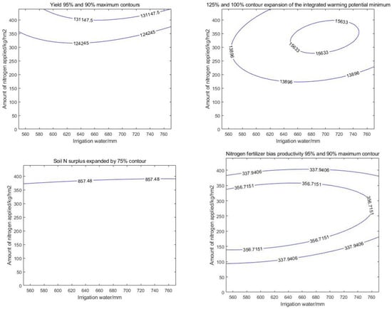 The four indicators were analyzed according to Table 8 and Figure 15, and the four indicators were evaluated in the range of 5%, 10%, and 15% of the optimum values. It was found that yield and nitrogen fertilizer biased productivity overlapped in each range, and soil N surplus and integrated warming potential deviated farther away and were not meaningful for finding water–N. Considering that the optimal values of soil N surplus and integrated warming potential were taken as the minimum values, a contour projection of 90% to 95% of the optimal values of yield and N fertilizer bias productivity indicators was adopted, and the optimal values of soil N surplus and integrated warming potential indicators were expanded by 100% to 125%, and the wells were analyzed to find the intersection of their irrigation water and N application.