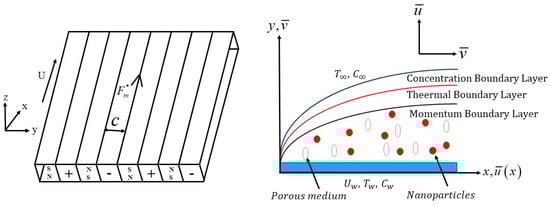 Consider a steady, two-dimensional, laminar flow of non-Newtonian second-grade fluid and Walter’s liquid B fluid circulating across a Riga surface. The Riga surface moves with a free stream velocity , in -direction () (see Figure 1). , , and terms represent the surface and ambient temperature of the Riga surface and surface and ambient concentration, respectively. The Riga plate is considered under the presence of electromagnetic force . Further, thermal radiation and external pollutant concentrations are considered in the temperature and concentration equation.