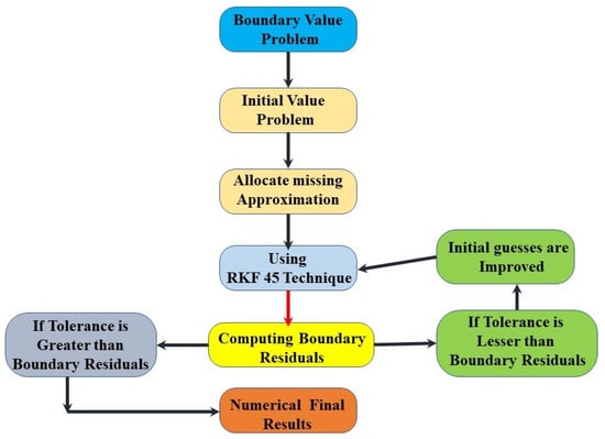 The transformed set of ODEs (8) to (10) and reduced boundaries, as stated in Equation (11), is challenging to obtain the analytical solution due to its high nonlinearity and two-point boundary nature. So, the solution of these equations is traced using the efficient numerical method. For this, we can convert the set of higher-order equations into first-order: