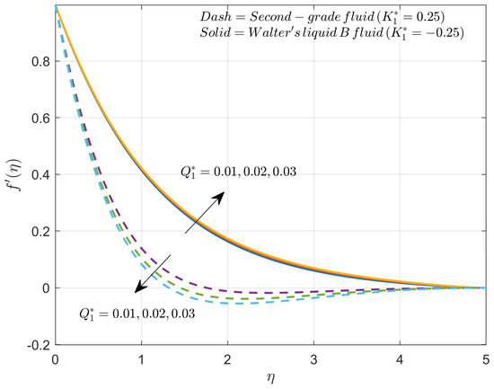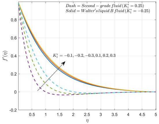 Figure 4 shows the variation in the velocity profile for improved values of the porous factor for both second-grade fluid and Walter’s liquid B fluid cases. The improved values of porous factor will reduce the fluid velocity in both the cases. The rise in porous factor will exhibit the resistance caused by the porous surface which acts as a barrier to the flow of liquid. Further, the porous medium will promote the interaction between the liquid and surface of the object which improves the thickness of the boundary layer. It is observed that velocity is more in second-grade fluid than Walter’s liquid B fluid in the presence of the porous factor.