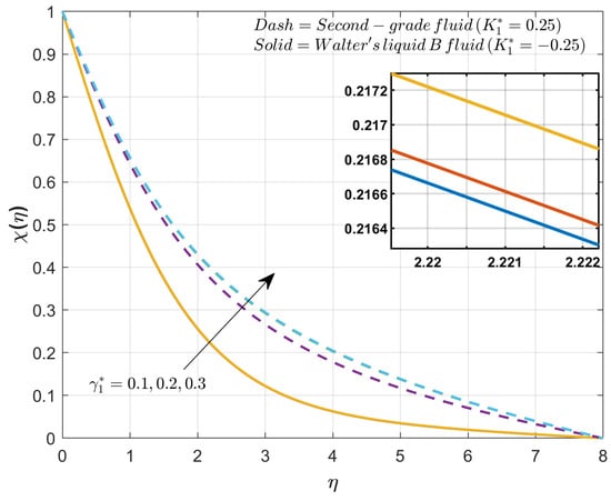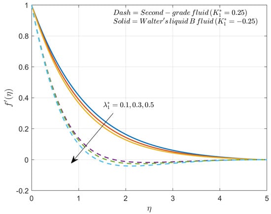 Figure 5 illustrates the impact of the modified Hartmann number over the profile for second-grade fluid and Walter’s liquid B fluid scenarios. The improvement in will improve the velocity profile in the second-grade fluid case while the reverse behavior is seen in the case of Walter’s liquid B fluid. In case the of second-grade fluid, improved will improve the external electrical impact over the liquid which improves the ability of the circulation, while in Walter’s liquid B fluid an improved will improve the viscosity of the liquid due to an improved electrical field, making it more resistant to movement. In the presence of the two liquid models behave differently over the velocity profile.