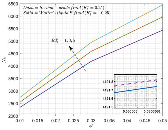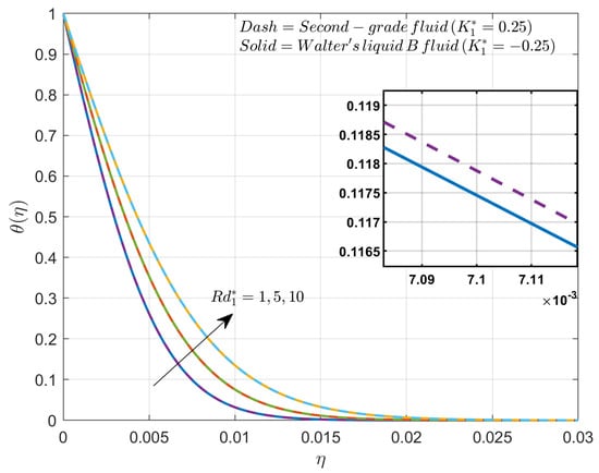 The variation in the thermal profile for changing values of the radiation parameter is illustrated in Figure 6. The improved values of will exhibit enhancement in thermal distribution. The adoption of radiation constraints reduces the , which improves the radiative thermal flux coefficients and radiative heat transmission rates into the liquid. Because of the increased radiative thermal transmission, the extent of the thermal boundary layer is noticeable. For the given radiation, Rosseland’s diffusion manner raises the temperature of the fluid. It is observed that Walter’s liquid B fluid shows greater thermal distribution than second-grade fluid. The Walter’s liquid B fluid will exhibit higher thermal conductivity as well as thermal diffusivity when compared to second-grade fluid. These properties of Walter’s liquid B fluid result in more distribution of heat in the fluid system within the presence of .