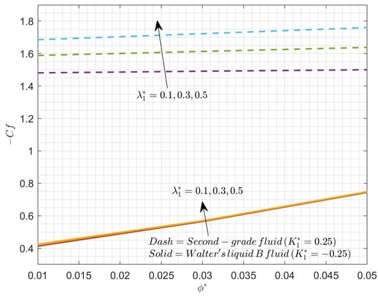 Figure 8 shows the impact of on over various values of . The improvement in these two factors will decline . The results show that Walter’s liquid B fluid exhibits less surface drag force than second-grade fluid in the presence of these two parameters. As improves it will offer additional resistance to the liquid flow and acts as a barrier; the addition of will enhance the thickness of the boundary layer. Due to its higher viscosity and higher tendency for the aggregation of particles, Walter’s liquid B fluid will experience lower than second-grade fluid.