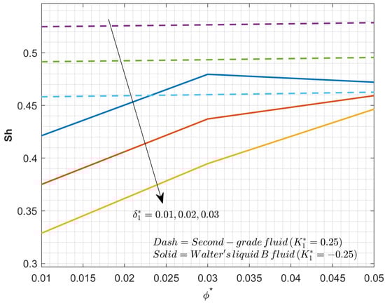 The impact of external pollutant source variation factor over the concentration profile is drawn in the Figure 7. The rise in will enhances the concentration in both second-grade fluid and Walter’s liquid B fluid cases. As improves, it releases more pollutants into the liquid. The enhancement in the impurities will intensify the concentration in the liquid. The Walter’s liquid B fluid shows a higher concentration curve than second-grade fluid. Walter’s liquid B fluid will exhibit higher viscosity, which decreases the dispersion, and slower dissolve of pollutants than second-grade fluid.