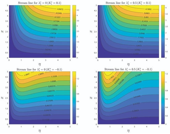 Figure 10 display the impact of on over various values of . The improvement in the values of and will decline the rate of mass transfer. Surface mass transfer is affected by alterations in external pollution sources. Higher values of result in increasing surface-level pollution or more rapid change. Pollutant concentration distributions within the liquid become more pronounced, which slows down the mass transfer rate. More impediments and disruptions are introduced into the fluid flow as the solid volume percentage rises. Because of the increased contact between liquid and solid particles, the surface transfer of mass to contaminants is slowed down. Further from the diagram, it is clear that second-grade fluid will exhibit a lower rate of mass distribution than Walter’s liquid B fluid. Figure 11 shows the streamline pattern for second-grade fluid and Walter’s liquid B fluid in the presence and absence of .