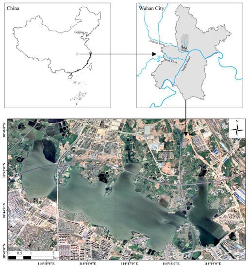 Lake Hou, situated in the middle and lower reaches of the Yangtze River, is a prototypical urban lake in Wuhan, Hubei Province. It is located between longitudes 30°45′ and 30°44′ E and latitudes 114°14′ and 114°19′ N (Figure 1), with an area of about 16.3 km2 and a watershed area of 157 km2. The lake’s shape is rectangular and elongated, with 9.06 km in length, average 2.11 km in width, and 2.2 m in average depth, with a reservoir capacity of 42.437 million m3.