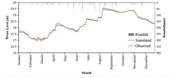 The simulations of water levels showed a strong consistent trend with the observed data (Figure 2), with a mean relative error (MRE) of 0.27% and a correlation coefficient (R2) of 0.99, which indicate that the performance was good. It is clearly shown that the average MRE was less than 10%, which indicates that the model can effectively simulate the changes in the lake’s water level [21,22].