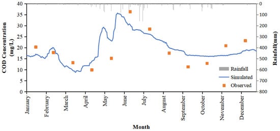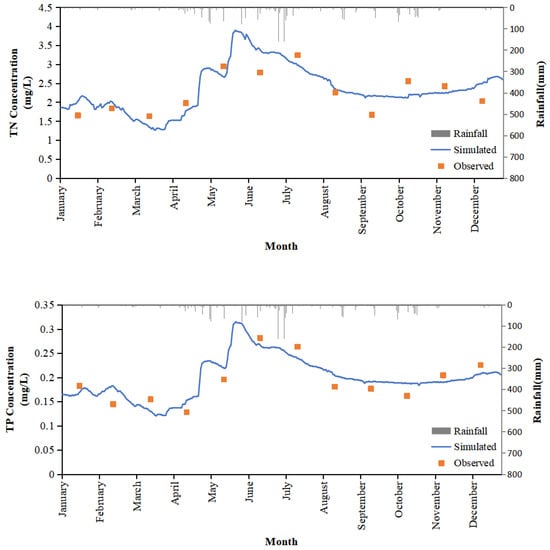 There were strong correlations between the simulated temporal TN, TP, and COD values and the surveyed data (Figure 3). The correlation coefficients for TN, TP, and COD simulations are 0.77, 0.86, and 0.80, respectively. The MRE values for TN, TP, and COD are 14.4%, 11.7%, and 22.9%, respectively. Based on the references [21,22,23], water quality modeling with relative errors less than 50% can be considered as acceptable performance. Therefore, the model established this time is sufficient to scientifically and reliably reflect the hydrological and water environment changes of Lake Hou.