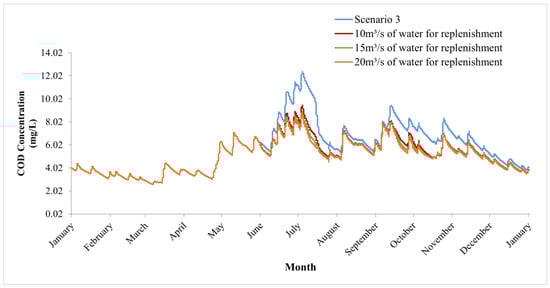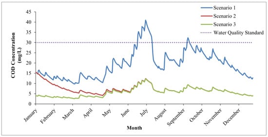 Simulation of the annual concentration change process of COD in Scenarios 1–3.