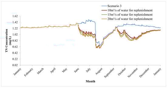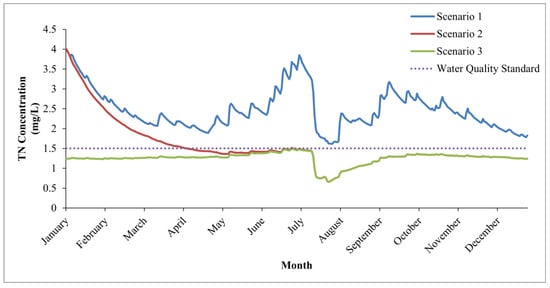 Simulation of the annual concentration change process of TN in Scenarios 1–3.