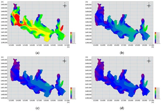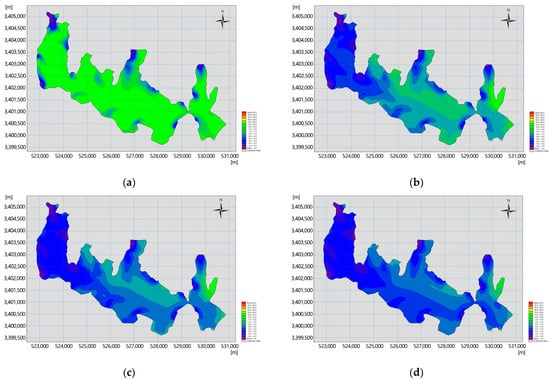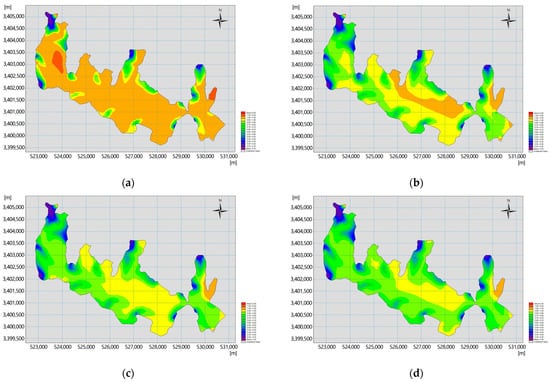 Spatial distribution of TN concentrations for different recharge flows in Lake Hou. (a) No diversion; (b) diversion of 10 m3/s; (c) diversion of 15 m3/s; (d) diversion of 20 m3/s.