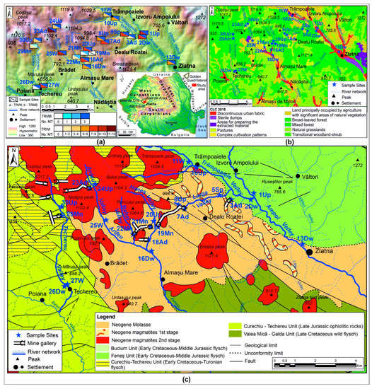 The maps of the Gold Mining Area of Zlatna (GMAZ) depict: (a) the locations of the sampling sites, with an emphasis on the taxonomic richness of the culturable microbiota (TRMB) and water invertebrates (TRWI). For TRMB and TRWI details see the first paragraph of Section 2.5. and Supplementary Table S1; (b) land use and human settlements; and (c) the simplified geological map modified after Borcoș et al. [45].