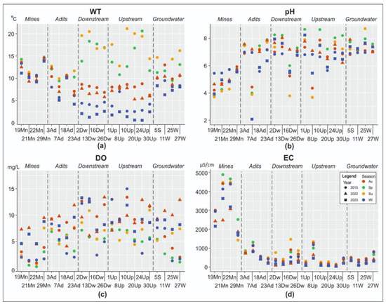 Individual value plots showing the seasonal and yearly distribution of the: (a) Water temperature(WT), (b) pH, (c) Dissolved Oygen (DO), and (d) Elecrical Conductivity (EC) of the 22 waters sampled in the GMAZ. The acronyms correspond to the sampled water sites (see Table 1).