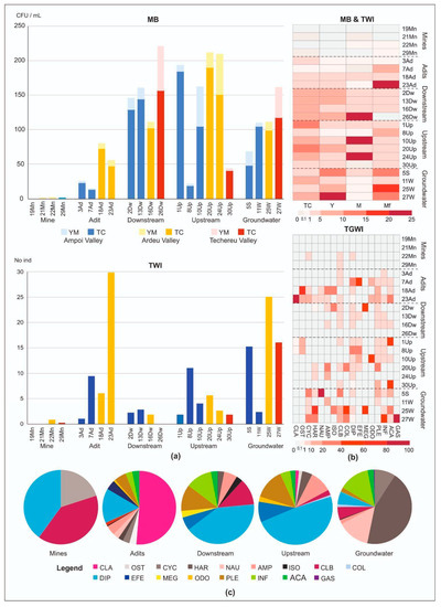 The frequency of TGWI varied among the different water sources, as shown in Figure 3c. The mine waters had only three TGWIs: 40% DIP, 40% CLB, and 20%CYC. Downstream had ten groups, and DIP was the most frequent at 41.2%, followed by PLE, INF, and CLB at 11.78%. Upstream had twelve groups, and DIP was again the most frequent at 48.5%, followed by PLE at 13.42%. Groundwaters had thirteen groups, with HAR being the most frequent at 44.11%, followed by NAU at 14.07%, and INF at 13.31%. Adit waters had fourteen TGWIs, with CLA being the most frequent at 51.3% and DIP being the second most frequent at 15.22%. The other TGWIs had a frequency smaller than 10%, as shown in Table S1.