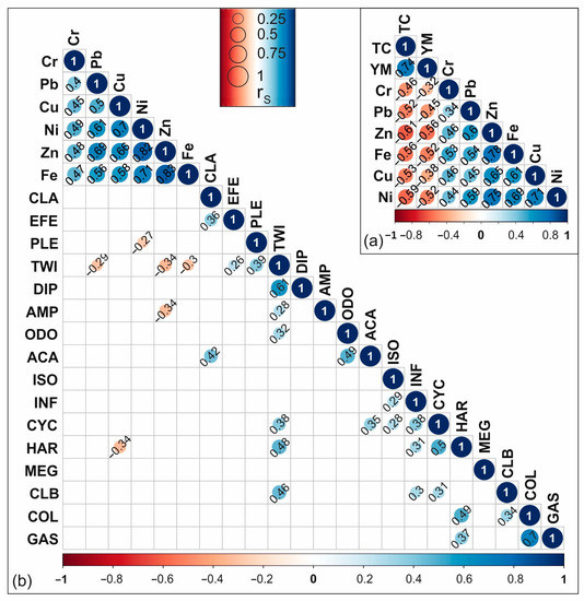 Spearman’s rank correlations (rS) between heavy metals and: (a) culturable microbiota (TC and YM) and (b) water invertebrates. The strength of the correlations is indicated as follows: 0 < rS < −3 = weak, −3 < rS < −5 = moderate, and −5 < rS < −7 = strong negative correlations. Only correlations with a p < 0.01 significance are shown. The three-letter acronyms correspond to the TGWI as shown in Figure 3. The Cu, Cr, Fe, Ni, Pb, and Zn values used in our analyses are available in the supplementary data of Papp et al. [21].