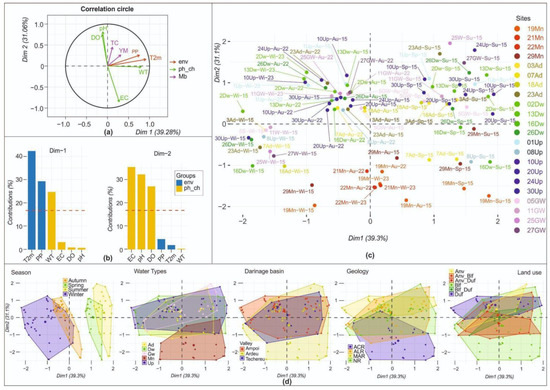 The multiple factor analysis (MFA) analysis shows the contribution of the physicochemical and environmental parameters to the MB in the GMAZ sampling sites: (a) The correlation circle of the vectors which correspond to the active groups of variables, env and ph-ch, and to the supplementary quantitative variables represented by MB. (b) The contribution of the quantitative variables in the first two dimensions. (c) The MFA plot based on the first two dimensions. (d) The polygons according to the qualitative supplementary variables: seasons, water types, drainage basins, geology, and land use. For the sites and legends acronyms, see Table 1.