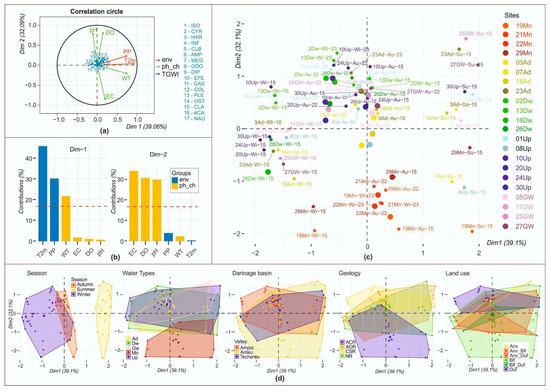The MFA analysis shows the contribution of the physicochemical and environmental parameters to the TGWI in the GMAZ sampling sites: (a) The correlation circle of the vectors, which corresponds to the active groups of variables, env and ph-ch, and to the supplementary quantitative variables represented by TGWI. (b) The contribution of the quantitative variables in the first two dimensions. (c) The MFA plot based on the first two dimensions. (d) The polygons according to the qualitative variables: seasons, water types, drainage basins, geology, and land use. For the sites and legends acronyms, see Table 1.