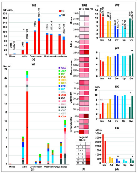 Differences between the water samples collected in 2015 and those collected in 2022–2023 in the GMAZ, presented as averages for the five water types: mines, adits, downstream, upstream, and groundwaters: (a) culturable microbiota averages; (b) water invertebrates averages; (c) taxonomic richness of biota (TRB); and (d) physicochemical parameters. * represent significant median differences (p < 0.05), ** represent p < 0.01, *** represent p < 0.001, from the Wilcoxon test.