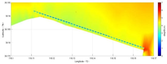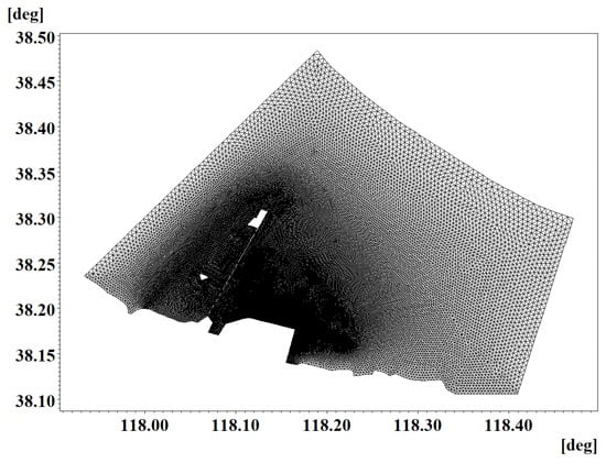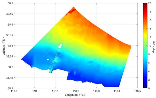 The SWAN model was used to calculate the research area, which covered the nearshore area of the Binzhou oyster reef restoration project, and could fully simulate the wave changes during strong winds. Local encryption was carried out in the oyster reef layout area, which could simulate the refined wave characteristics of the project sea area. The horizontal triangular mesh grid had a total number of 154,048 with 48,053 grid nodes and a uniform grid transition resolution. In terms of horizontal grid allocation, the oyster reef deployment area was encrypted, with a resolution of about 5 m; it has a resolution of about 1 km in the model open boundary, and the grid uniformly transitions from the encryption area to the open boundary area. For the model water depth, electronic bathy grams and the measured water depth were used in this paper. Different bathygrams were converted to a uniform datum plane by the control points. The calculation time of the model was set to 20 min, and the output time of the model was set to 1 h. The model adopts the JONSWAP spectrum, and the spectral peak factor was adopted as the default value, which is 3.3. The common calculation formula is used to consider the four-wave interaction of the waves. The specific model physical process settings are shown in Table 1. The distribution of water depth is illustrated in Figure 5.