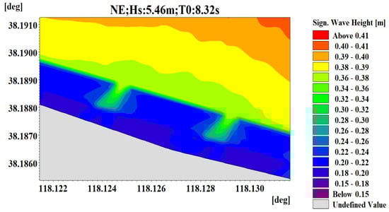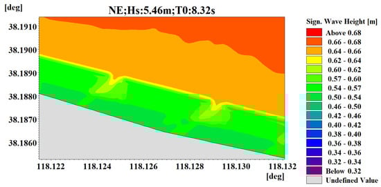 Figure 8 and Figure 9 display the wave distribution near oyster reefs under the designed high-water-level (DHL) conditions, with wave boundary conditions incident from the N direction with Hs of 3.2 m and T0 of 7.13 s, and incident from the NE direction with Hs of 5.46 m and T0 of 8.32 s, respectively. From the figures, it can be observed that the wave-dissipation process is similar to the EHL conditions, as waves propagate from the deep-water region to the shallow-water region where the oyster reefs are located.