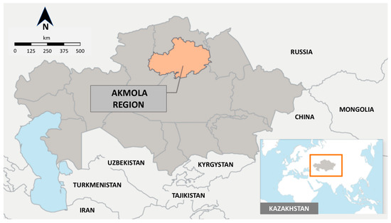 Figure 1 shows the location of the Akmola Region inside the Republic of Kazakhstan. This region is located inside Northern Kazakhstan, with the city of Kokshetau being the administrative center and one of the most dynamically developing regions of Kazakhstan in recent years. It is characterized by an increasing population and employment in both agricultural and industrial production.