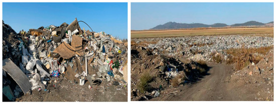 To analyze the proportion of plastic in the waste disposed of at both landfills, six waste samples weighing up to 2 kg each were randomly collected. The sampling points were determined using GPS and are detailed in Table 3 and illustrated in Figures S3 and S4 (Supplementary Materials).