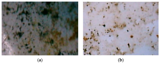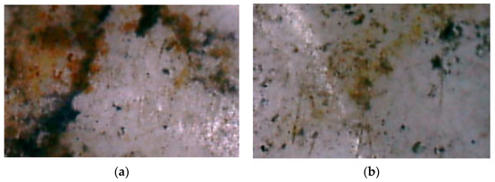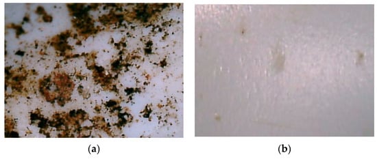 Surface of the (a) contaminated plastic and (b) cleaned plastic of sample No. 3 from Shchuchinsk’s landfill, observed microscopically (30% H2O2 solution and 0.05 M FeSO4 solution), with pre-treatment with heated water.