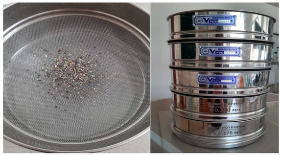 The list of used equipment and materials includes: a DTX 500 LCD Levenhuk microscope with photo- and video-recording capability (Levenhuk Inc., Tampa, FL, USA); AX-200 Shimadzu analytical electronic scales with a measurement accuracy of 0.0001 g (Shymadzu Inc., Kyoto, Japan); stainless-steel sieves with mesh sizes of 3, 2, 1, 0.3, and 0.175 mm; a TS-1/80 SPU dry-air electric thermostat (Smolensk Special Design and Technology Office, Smolensk, Russia) for which the maximum deviation of the average temperature of any point in the working volume from the set temperature in steady-state thermal conditions was no more than ±1 °C (the maximum deviation of temperature at any point in the working chamber from the average was ±0.4 °C); an Ekros-4310 water bath (Ekros Inc., Moscow, Russia); Whatman 42 filters for the quantitative analysis (Little Chalfont Inc., Buckinghamshire, UK); Sefar polyamide filters with a mesh size of 300 microns (Sefar Inc., Heiden, Switzerland); an Opn-3.01 «Dastan» laboratory centrifuge with rotation speeds of 1000, 1500, and 3000 rpm (Dastan Inc., Bishkek, Kyrgyzstan); a set of hydrometers; a 5.32 M NaCl solution; and a 5.75M ZnCl2 solution.