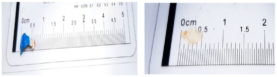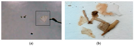 During the identification of microplastics, particles with shiny surfaces, bright colors, and sharp geometric shapes were taken into consideration [63,71,72]. These particles were then classified based on their shape, such as fibers and non-fibrous materials like debris (angular and hard), films (flexible and thin), or pellets (rounded and hard), along with their size (as shown in Figure 9).