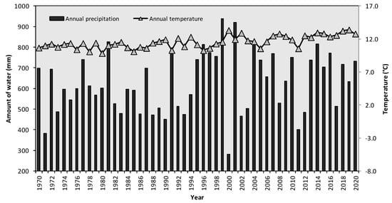 The climate in the study area is semiarid in the summer period, but weather conditions are very variable where drought is a regular phenomenon and with occasional periods of extremely high precipitation [22]. Yearly climate variability is presented in Figure 1.