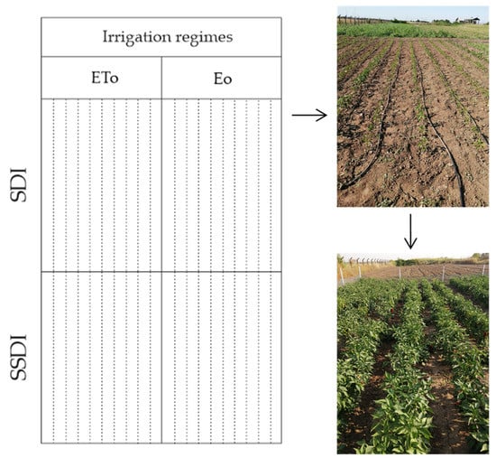 The experiment was organized as a block design adapted to the technical specifications of the drip irrigation system (Figure 2). The experiment included the kapia pepper “Amfora”, transplanted to the field at the end of May, with a between-row spacing of 0.7 m and an inter-row spacing of 0.25 m. Each plot was 8.4 m2 and replicated three times. Harvest was conducted on 14 September at maturity.